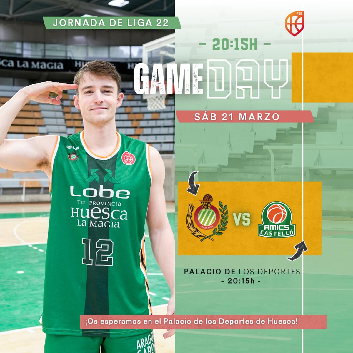 Nueva jornada de Liga Segunda FEB para Lobe Huesca La Magia, que juega este sábado 21 de marzo en el Palacio de los Deportes de Huesca contra Amics Castelló. Un rival muy fuerte, segundo clasificado con 16 victorias y empatado con la primera plaza. Sin duda un encuentro donde Peñas Huesca tendrá que agarrarse al empuje de la afición para poder competirlo y tener opciones de victoria. En el descanso del partido será la presentación de la cantera temporada 2025-26, por lo que las gradas tendrán un especial color verde. El calor peñista será el sexto jugador en esta jornada.